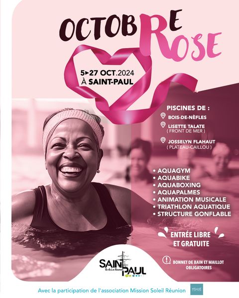 Cette année encore, la Ville de Saint-Paul se mobilise à l’occasion d’Octobre Rose, campagne de sensibilisation au cancer du sein. En partenariat avec l’association Mission Soleil Réunion (MISOLRE), le service des aires nautiques propose un programme sportif dynamique dans ses piscines municipales, tout en sensibilisant le public à la prévention solaire.