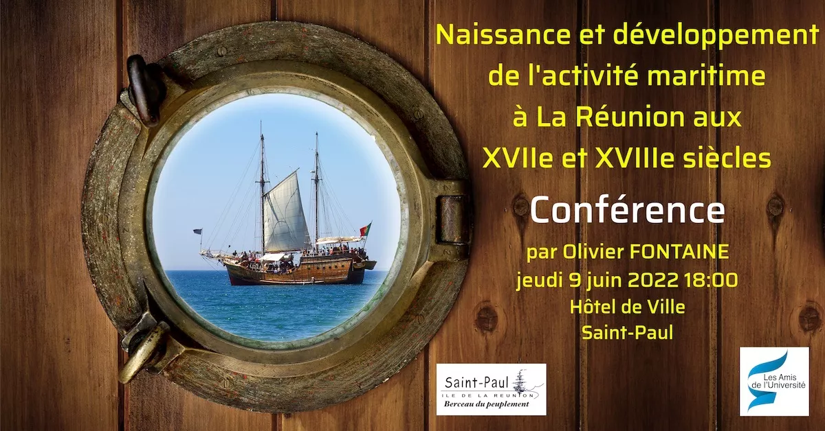 Ce jeudi 9 juin, les amis de l’université, en partenariat avec le service arts et culture, dans le cadre des Journées de l’Archéologie, organise une conférence très intéressante, à l’hôtel de ville de Saint Paul, sur l’activité maritime de l’île Bourbon aux XVIIe et XVIIIe siècle.