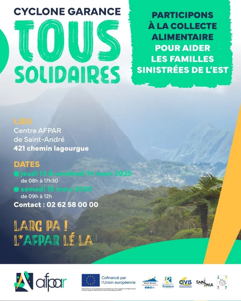 L’AFPAR se mobilise autour d’une opération de collecte de denrées alimentaires et de produits d’hygiène à destination des familles sinistrées de l’Est de La Réunion, en s’unissant avec l’association ATOUT974, association d’entraide sociale orientée principalement vers l’aide alimentaire, l’insertion professionnelle et la cohésion sociale.