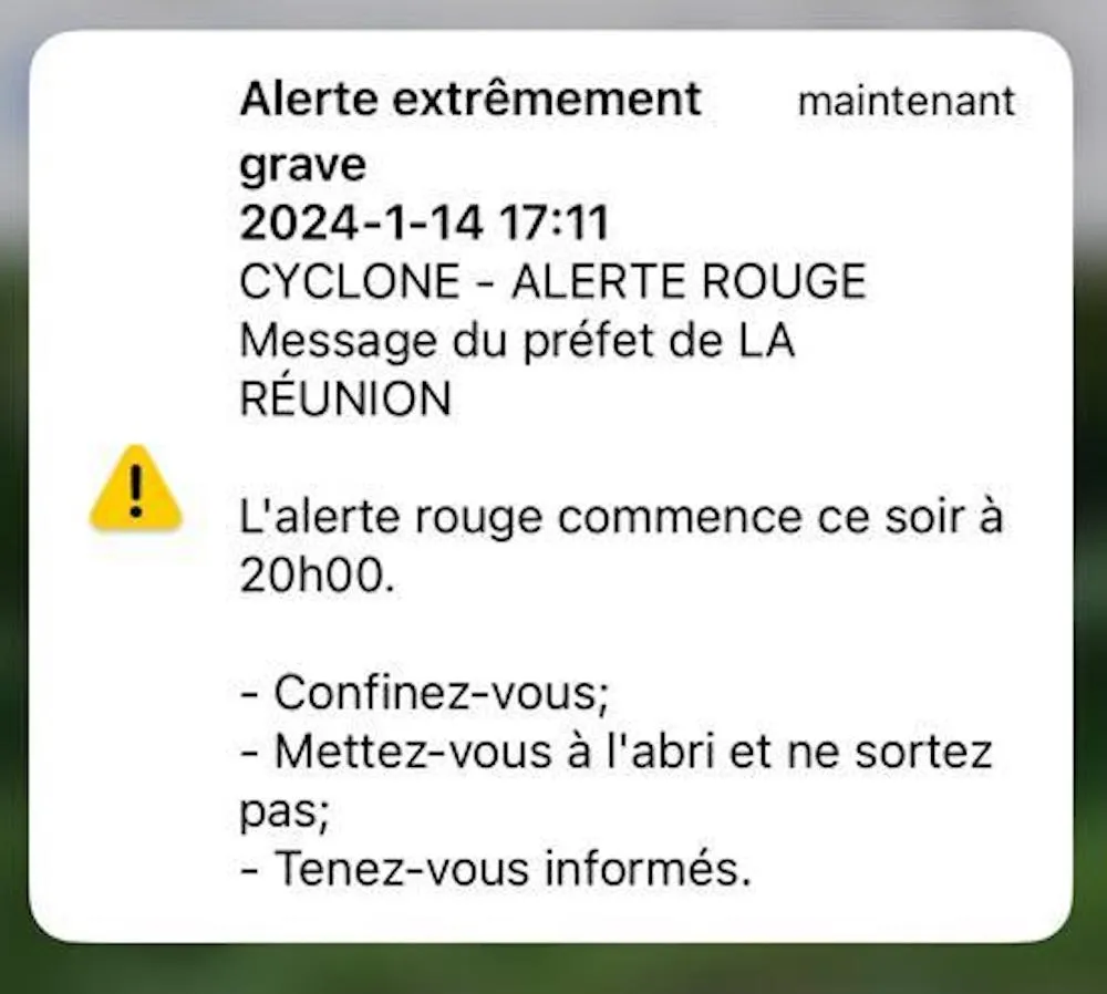 Le préfet a utilisé ce soir l’outil « FR-Alert » pour envoyer une alerte aux réunionnais sur l’alerte rouge avec une sonnerie très longue et alarmante.