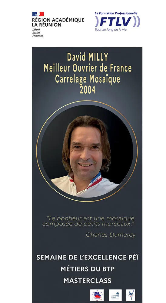 Reçu à la Sorbonne et à l’Elysée pour le concours de « Meilleur Ouvrier de France », David Milly a réalisé la réplique exacte d’un dodécaèdre étoilé qui se trouve sur le sol de la porte Saint-Pierre de la Basilique San Marco à Venise, et qui a été créé entre 1425 et 1430. Une fois terminée, la rosace est passée entre les mains de plusieurs jurys dans différentes villes de France avant de s’arrêter à Poitiers. Là, le Jury National a déclaré l’œuvre conforme au travail exigé. C’est ainsi qu’en mars 2004, David Milly a été désigné Meilleur Ouvrier de France en carrelage -mosaïque d’art.