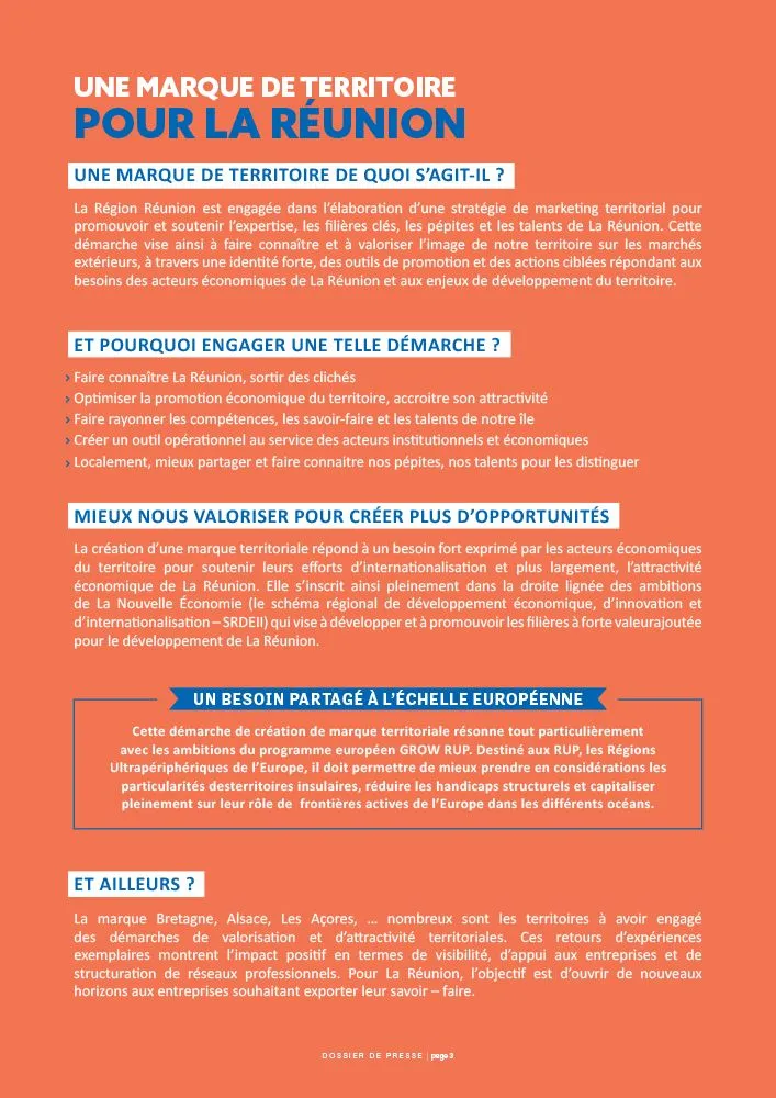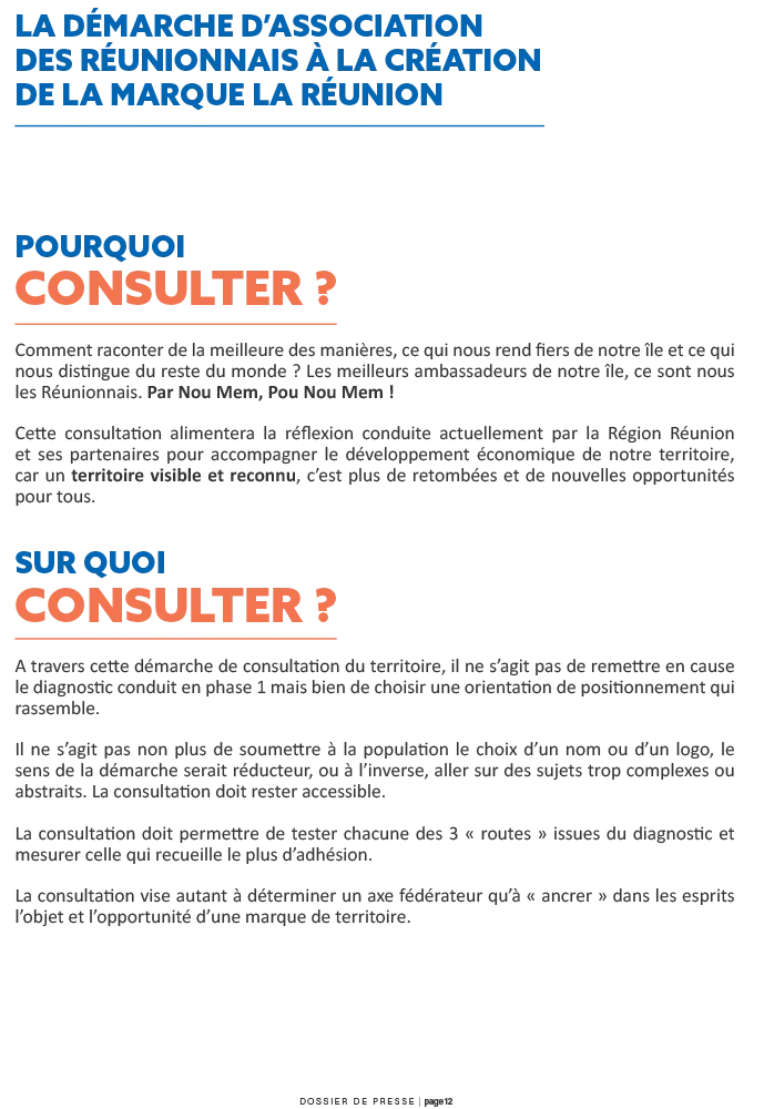 « Ce que nous lançons aujourd’hui est bien plus qu’une marque de territoire. La marque n’est que l’outil ou le véhicule pour illustrer et incarner ce que nous voulons engager ensemble. Ce que nous voulons engager avec les Réunionnaises et les Réunionnais, c’est une véritable démarche partagée pour valoriser notre terre réunionnaise et notre peuple réunionnais. Ces éléments, qui sont constitutifs de notre identité territoriale et dont nous sommes si fiers.
