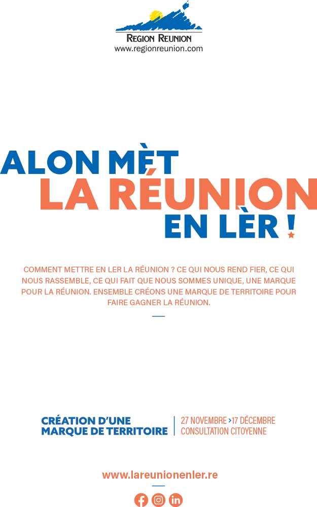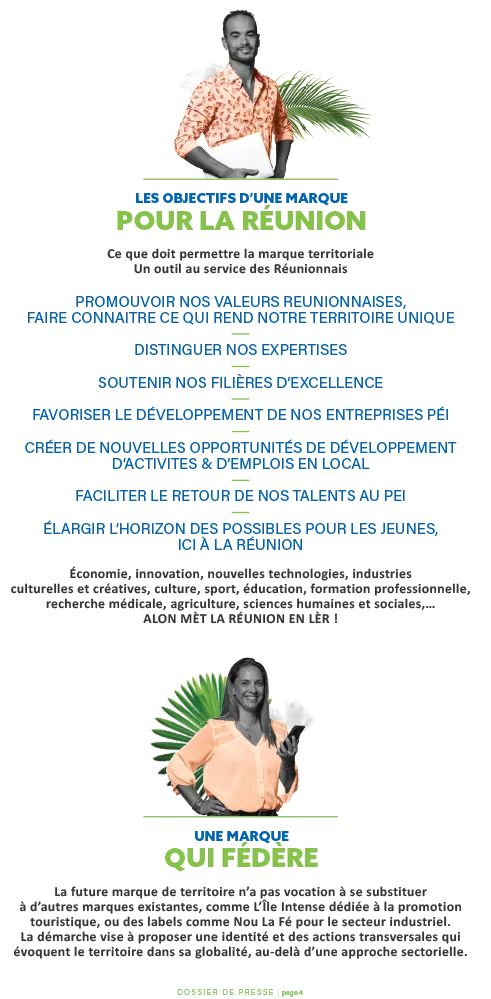 La Région a donc souhaité répondre à cette demande des acteurs du territoire, tout en proposant une action inédite pour élargir le champ de cette marque et lui permettre d’embrasser la pluralité de nos singularités. Ce qui nous anime est de développer ce projet collectif en réaffirmant de manière simple la fierté réunionnaise. Pour promouvoir et soutenir le meilleur de La Réunion.