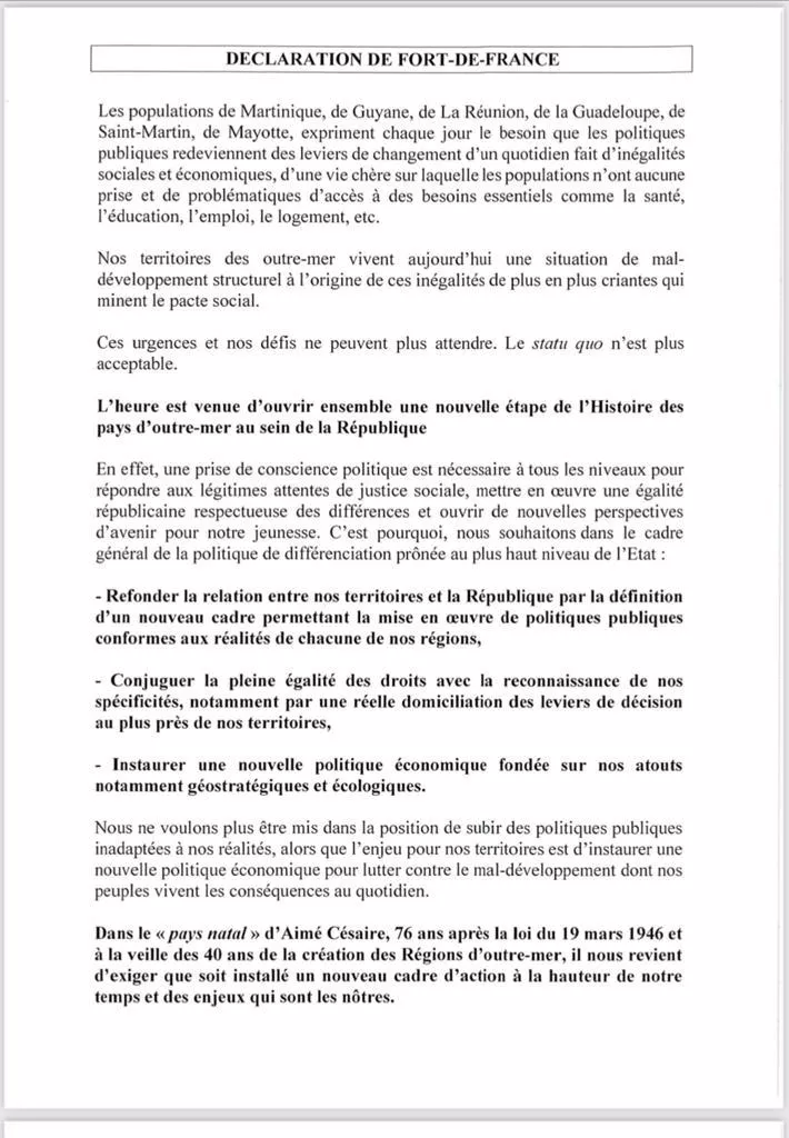 Face aux situations « de mal-développement structurel à l’origine d’inégalités de plus en plus criantes qui minent le pacte social », les président.e.s ont rappelé l’urgence d’ouvrir une nouvelle étape historique pour nos territoires d’outre-mer. Cette déclaration de Fort-de-France est un appel à une prise de conscience politique au plus haut niveau de l’Etat, en concertation avec nos populations et les forces vives, pour agir sans délai autour de trois axes forts :