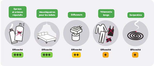 • Se protéger des piqûres : Utiliser des sprays anti-moustiques, moustiquaires, diffuseurs, serpentins, et porter des vêtements longs.