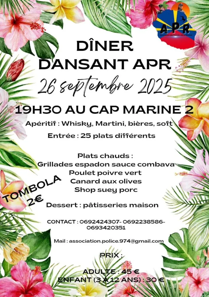 L’Association des Policiers de La Réunion (APR) invite le public à partager un moment festif et convivial lors de son dîner dansant prévu le vendredi 26 septembre 2025 à 19h30, au Cap Marine 2.