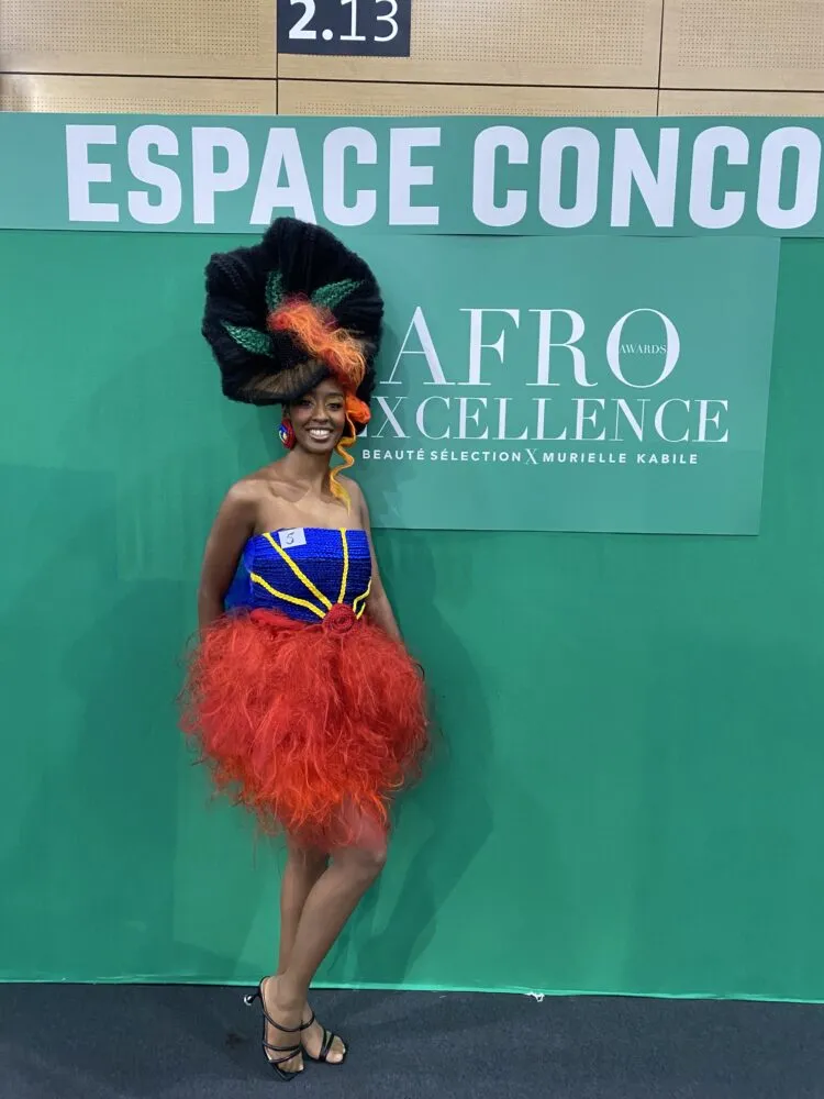 La réalisation présentée sur Océane Mangata rend un hommage puissant à La Réunion et à son volcan, avec une coiffure sculpturale et une tenue entièrement conçue en cheveux, aux couleurs du drapeau réunionnais, arborant fièrement le 974.