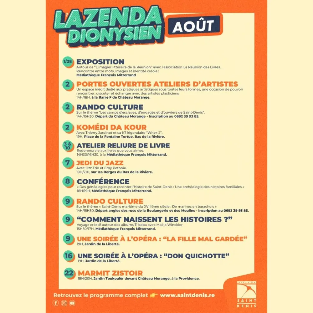 Dès le 1er août, une exposition autour de « L’Imagier littéraire de La Réunion » est à découvrir à la Médiathèque François Mitterrand. Le 2 août, les portes ouvertes des ateliers d’artistes à la Barre F – Château Morange permettront de rencontrer des créateurs locaux. Le même jour, une rando culture retracera l’histoire des anciens camps d’esclaves et d’ouvriers de Saint-Denis, suivie le soir d’une “Komédi da Kour” au Bas de la Rivière.