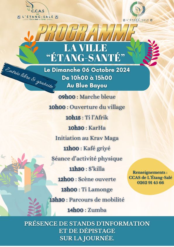 De 10h30 à 15h00 : marche pour la santé et début des animations ; dépistage du diabète, dépistage VIH, parcours de simulation alcoolémie, parcours de simulation vieillissement, atelier bébé signe, initiation au numérique, atelier lutte anti-vectorielle, création des espaces Mon Espace Santé, conseil nutritionnel, animation jeux en bois, initiations sportives….