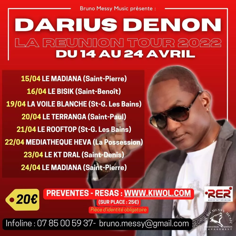 On en rêvait, Darius Denom sera bien là au mois d’avril à l’île de La Réunion pour une tournée événement organisée par Bruno Messy Music. Save the date : du 14 au 24 avril, c’est aux quatre coins de l’île que notre artiste au grand cœur interprètera son tube de toujours : Je t’emmène et les succès de ses multiples albums.