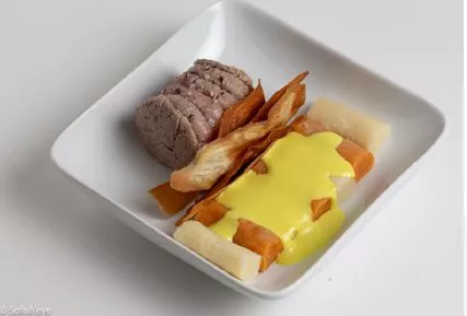 •  Filet mignon de veau, gnocchis de pomme de terre et patate douce, sauce crémée curcuma-citronnelle.