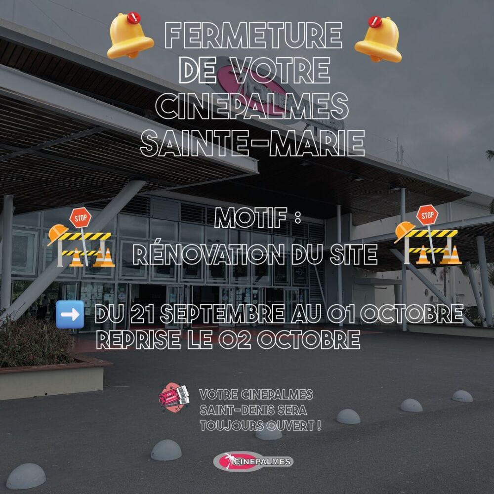 Le Cinépalmes de Sainte-Marie fermera ses portes à partir du samedi 21 septembre jusqu’au mardi 1er octobre 2024 inclus pour des travaux de rénovation.