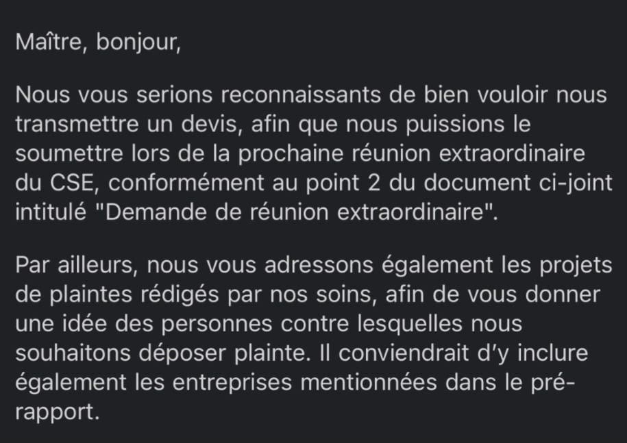 Selon eux, le cabinet sollicité pour l’expertise serait proche de l’intersyndicale. Idem pour l’avocat chargé de déposer plainte, « qui n’est autre que celui de la déléguée syndicale FO dans son affaire qui l’oppose à la SPL Estival aux Prud’hommes. Il y a conflit d’intérêt ». Les membres du Collectif en veulent pour preuve un échange entre l’intersyndicale et l’avocat en question.