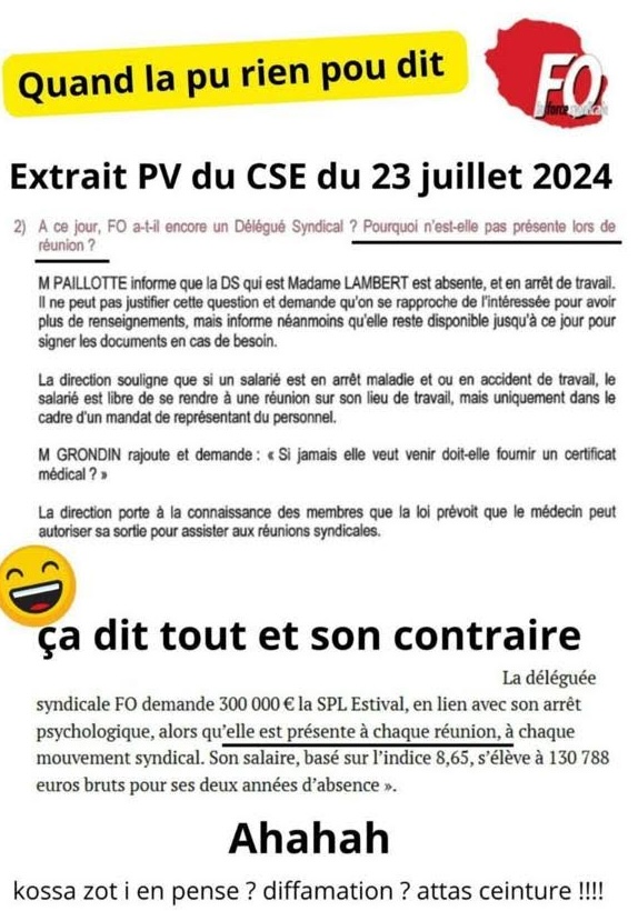 Rien ne va plus entre les salariés de la SPL Estival dont une partie reproche à l’intersyndicale « d’avoir semé la zizanie au sein du personnel uniquement pour assouvir les velléités politiciennes de la déléguée syndicale de FO, proche de Philippe Le Constant et de Jean-Hugues Ratenon, et qui veut se venger de Patrice Selly ». Des tracts circulent, qui donnent une idée de l’ambiance qui règne au sein de la société où les arrêts-maladies se multiplient, à tel point que « tout le CSE est malade », fait remarquer un membre du Collectif.
