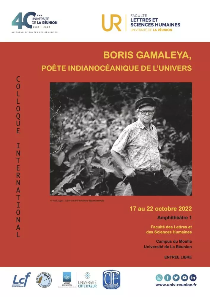 Le colloque international « Boris Gamaleya, poète indianocéanique de l’univers » aura lieu du 17 au 22 octobre 2022 à l’amphithéâtre 1 de l’UFR Lettres et Sciences Humaines (Campus du Moufia). Cet événement est organisé par LCF et DIRE. L’entrée y sera gratuite.