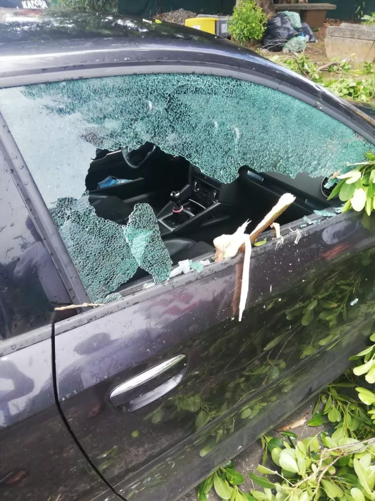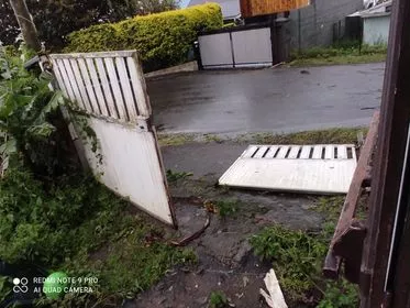 Saint Pierre : les premiers dégâts chez les particuliers. A Montvert les Hauts, cette dame s’est réveillée avec son parc poules cassé et son portail dans le même état.