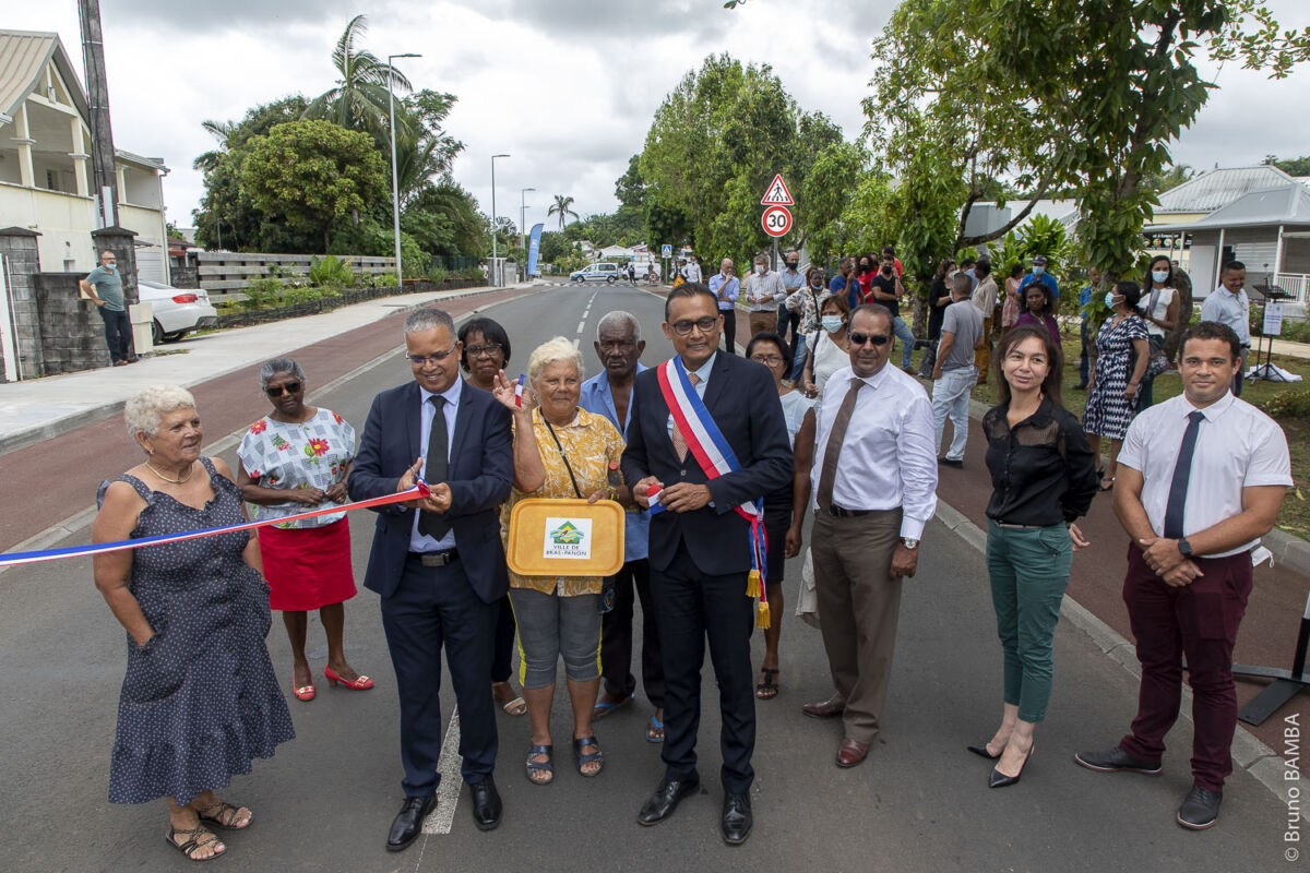 À la Rivière-du-Mât-les-Haut, plusieurs habitants du quartier ont pris part à l’inauguration des travaux d’aménagement de la RD48-1 dont le tronçon traversant le bourg est désormais doté de pistes cyclables sur les 2 côtés de la chaussée. Deux autres tranches du chantier, actuellement en cours, comprennent la réalisation de muret de soutènement et de pistes cyclables qui se poursuivront jusqu’en 2022 et jusqu’à l’échangeur de Paniandy. Près de 2 M€ sont consacrés à cet axe majeur emprunté par près de 7000 véhicules par jour. Deux autres événements ont marqué le passage des élus départementaux à la Rivière-du-Mât-les-Haut. Primo, la plantation symbolique d’espèces endémiques et indigènes préfigurant la création de micro-forêt urbaine devant le siège de l’Office du tourisme de l’Est, dans le cadre du plan 1 million d’arbres pour La Réunion. Secundo, la remise des clés au maire, d’un Kave ou Kiosque à vocation économique, construit sur un délaissé départemental au croisement de la RD48 avec la route menant vers l’Eden.