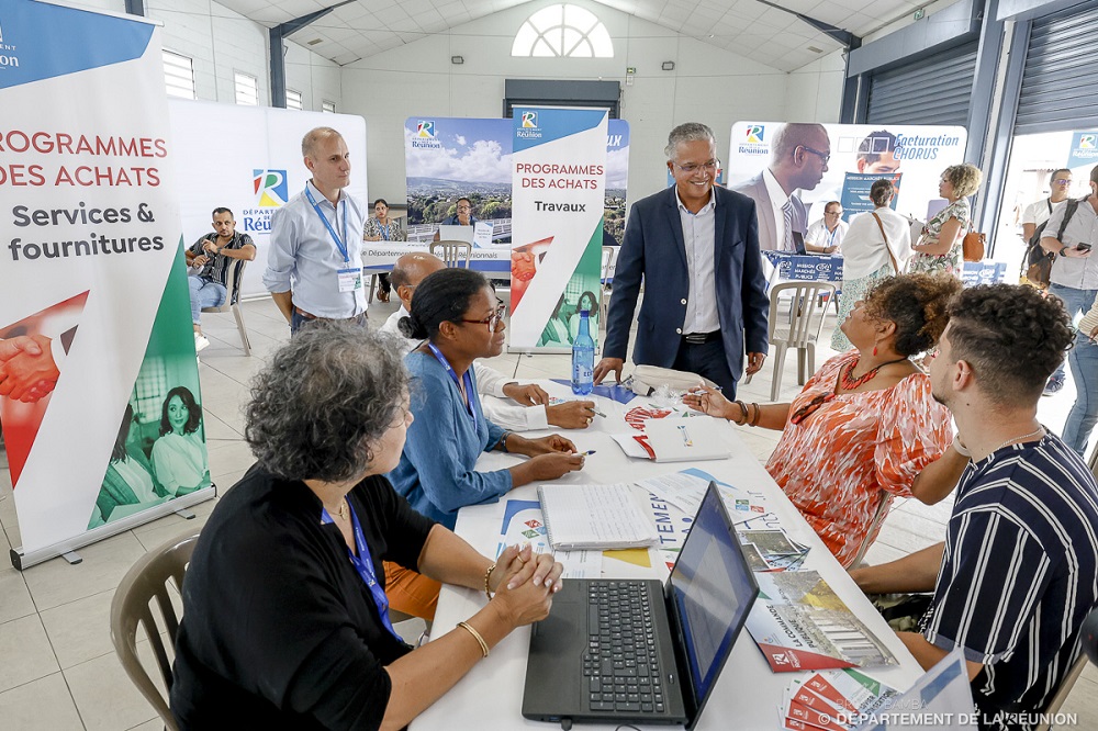 En compagnie du Maire de Bras-Panon et Vice-président du Département Jeannick Atchapa, le président Cyrille Melchior est venu à la rencontre des participants aux RDCP. « Notre premier objectif, c’est de porter les informations au plus près des citoyens et de faciliter au maximum l’accès des entreprises aux commandes publiques en toute transparence, a-t-il réitéré. Lorsqu’on regarde le volume d’investissement, le Département est la collectivité qui investit le plus sur le territoire. Pour 2024, la commande publique départementale représente un investissement de près de 200 millions d’euros. Nous intervenons dans tous les domaines à travers les travaux de construction, d’amélioration ou d’entretien des routes, des collèges, de l’eau, de l’habitat et de bien d’autres services… Nous continuerons aussi à soutenir les travaux de proximité des communes dans les établissements scolaires, les routes communales ou les équipements sportifs, via la 3e génération du PST (Pacte de Solidarité Territoriale) ».