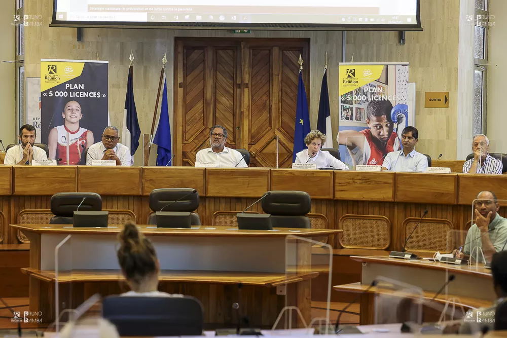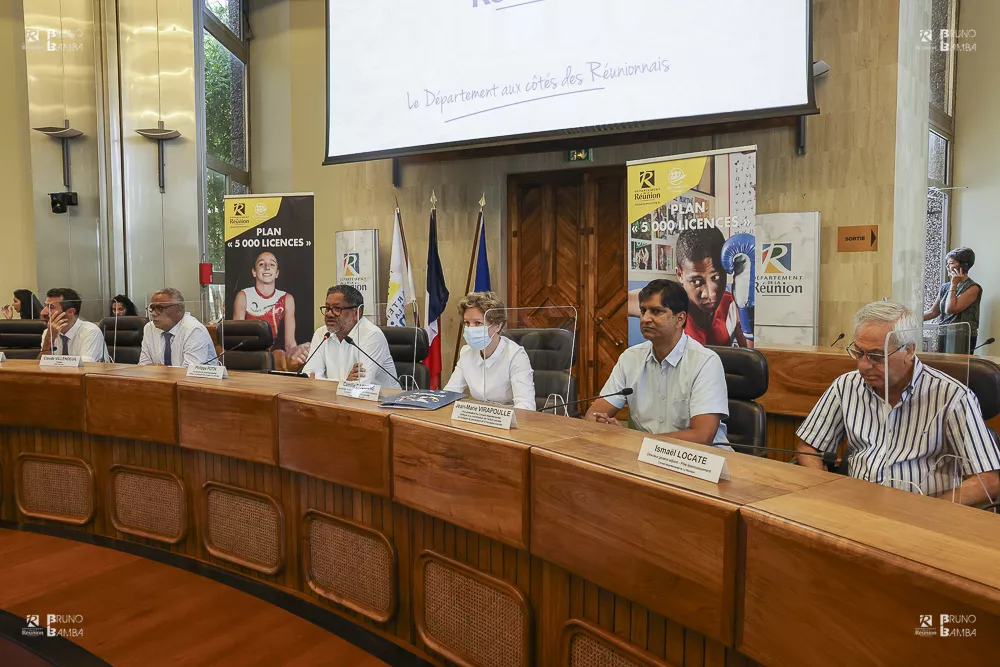 Les acteurs du sport se sont réunis, ce vendredi 29 avril, au sein de l’Hémicycle du Conseil départemental pour une présentation du « Plan 5000 licences » présidée par Philippe Potin, vice-Président délégué aux sports et au bien-être, représentant Cyrille Melchior, président du Conseil départemental, et en présence à la tribune de Jean-Marie Virapoullé, Vice-président délégué à la coordination de l’action sociale et à la stratégie de prévention et d’inclusion sociale, de Camille Dagorne, sous-préfète, chargée de la cohésion sociale et de la jeunesse ainsi que de Claude Villendeuil, Président du Comité Régional et Olympique et Sportif de La Réunion (CROS).