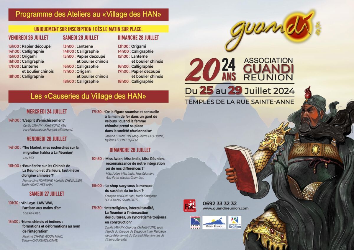 Chaque année depuis 20 ans maintenant, la communauté chinoise de La Réunion s’attache à ce que ces célébrations soient partagées avec le plus grand nombre, grâce à l’engagement de la Fédération des associations chinoises, de l’association Guan Di et des temples qui s’associent à l’évènement. Pour ce 20ème anniversaire, les organisateurs ont préparé une édition historique marqué par des spectacles, des conférences, des expositions ou encore des visites guidées de temples.