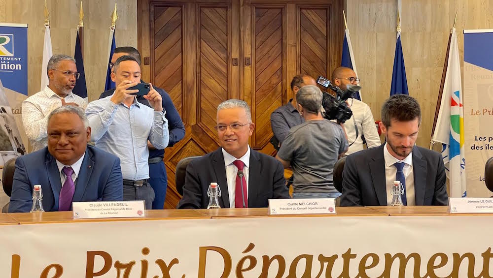 Cyrille Melchior avec à sa droite Claude Villandeuil, président du CROS et, à sa gauche, Jérémie Le Guillou, représentant du préfet de la Réunion.