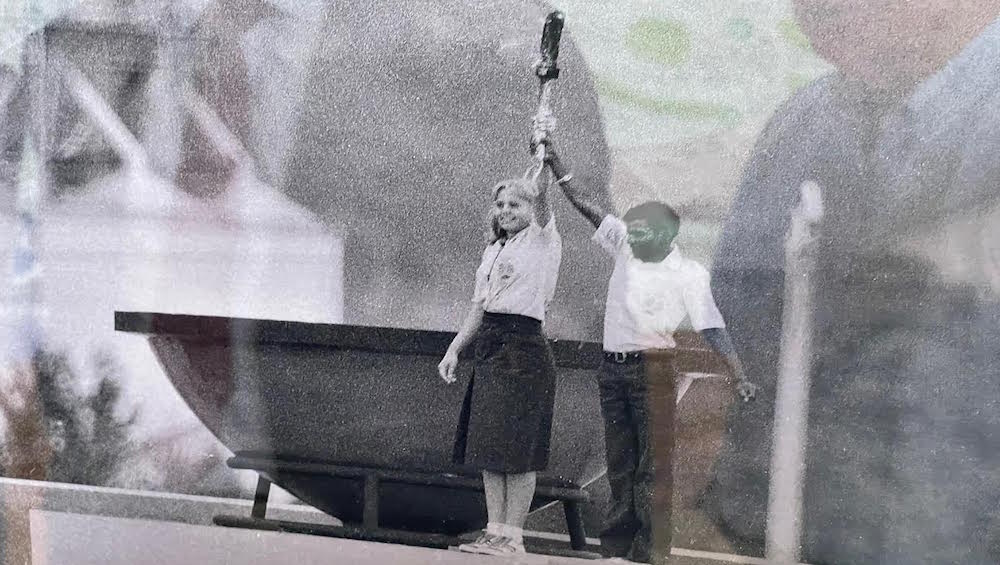 Photo signée Claude Testa sur laquelle on peut voir Raymond Tangachi, le coureur réunionnais, et la championne de tennis de l’époque portant la flamme des JIOI en 1979.