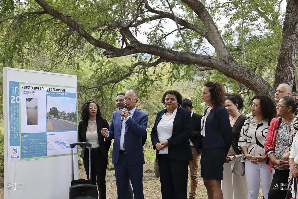 Après la séquence de signatures, direction la rue Général de Gaulle au lieu-dit Trois Ravines, où le projet de création d’ouvrages de franchissement a été présenté. De nouveaux ponts devront être construits en remplacement des 3 radiers existants. Actuellement en phase de reconnaissance préalable, les travaux qui démarreront en 2024 pour un coût estimé à 20M€, consistent à offrir un itinéraire direct des Hauts de Saint-Louis jusqu’à la RN1 pour plus de 10 000 véhicules par jour.
