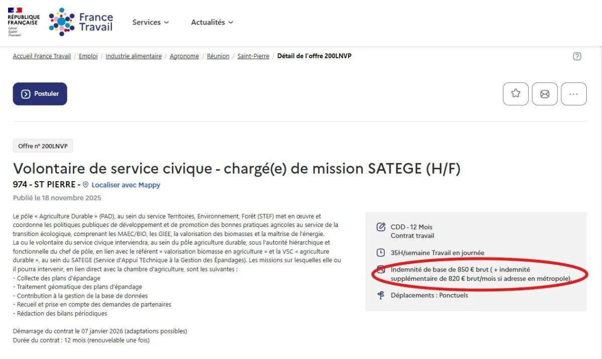 Frédéric Maillot, député de La Réunion, a réagi vivement à la diffusion d’une offre de volontaire de service civique (VSC) proposée par la DAAF et relayée par France Travail. Dans sa publication, l’élu dit son indignation face à une annonce qui prévoit une indemnité supplémentaire de 820 euros pour les candidats résidant en métropole, ainsi que la prise en charge d’un billet d’avion aller-retour.