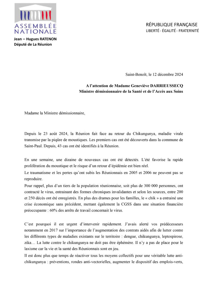 Face à la réémergence du chikungunya à La Réunion, le député Jean-Hugues Ratenon interpelle la Ministre de la Santé démissionnaire, Geneviève Darrieussecq, sur l’urgence d’intensifier les actions de prévention et de lutte contre ce virus. Avec 43 cas confirmés depuis août 2024 et la menace d’une nouvelle épidémie, le parlementaire appelle à une mobilisation immédiate pour protéger la population et éviter une crise sanitaire et économique similaire à celle de 2005-2006.