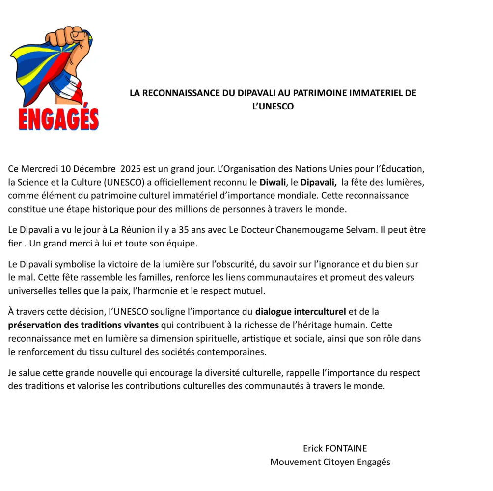 « Je salue avec une immense fierté l’inscription du Dipavali au patrimoine culturel immatériel de l’humanité par l’UNESCO. Cette reconnaissance internationale consacre une tradition ancestrale porteuse de valeurs universelles de lumière, de paix, de partage et d’espérance.