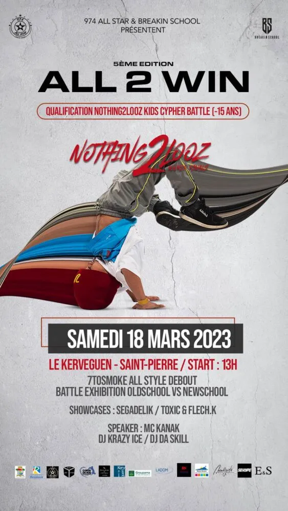Le festival « All2Win » se tiendra le 18 Mars 2023 au Kerveguen de Saint-Pierre et est ouvert à tous les passionnés du hip-hop, quel que soit leur âge ou leur niveau de pratique. Ne manquez pas