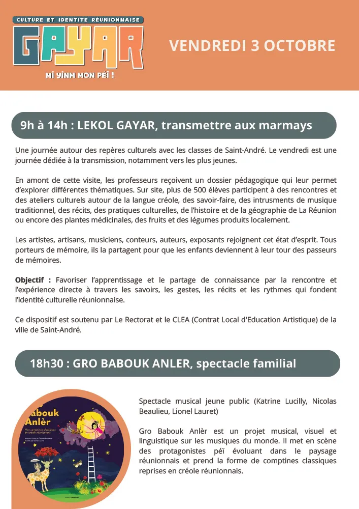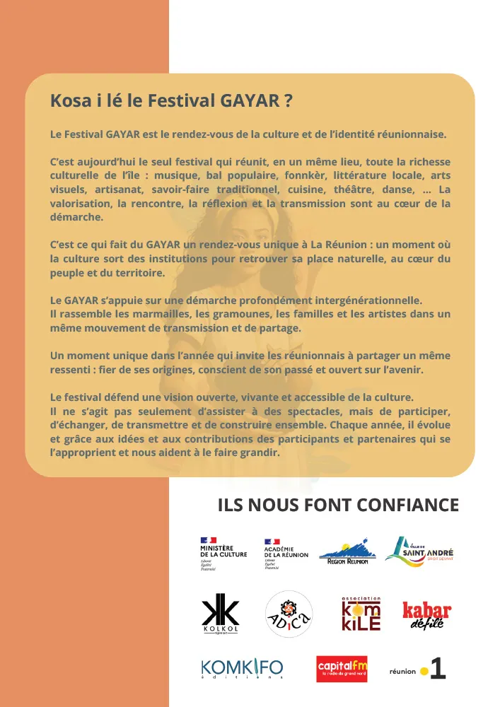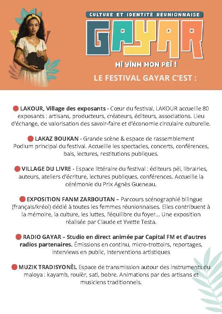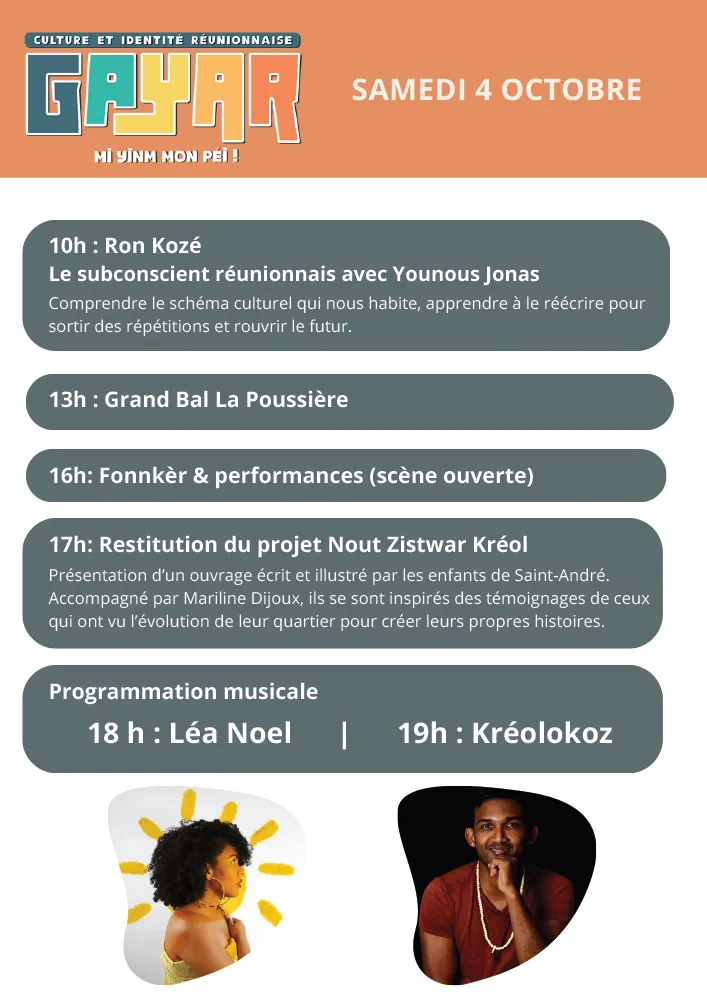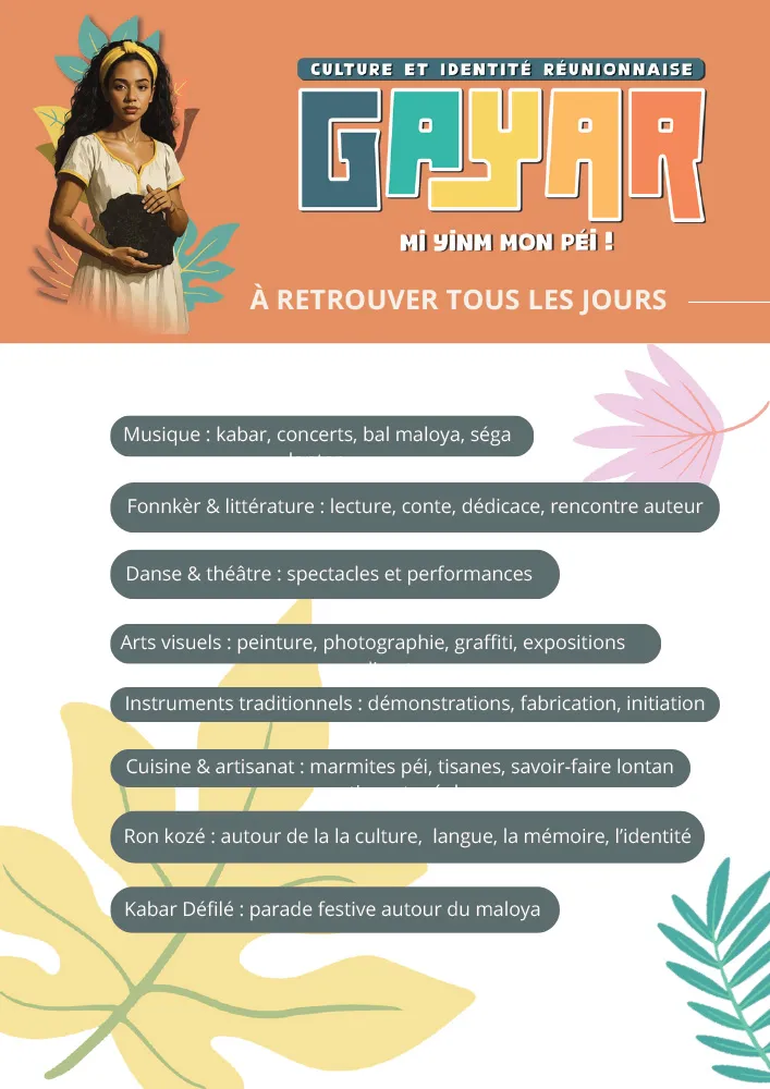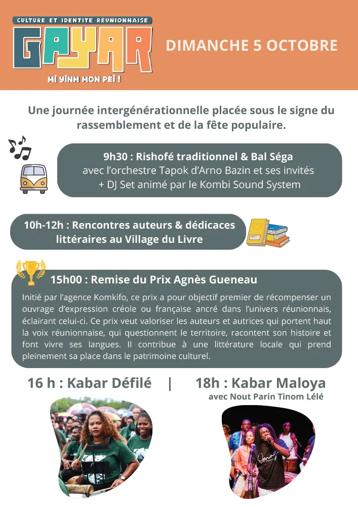 Pensé comme un lieu de transmission et de partage, l’événement rassemble chaque année des milliers de visiteurs autour de la musique, du théâtre, de la littérature, des arts visuels, de la danse ou encore de la cuisine péi.