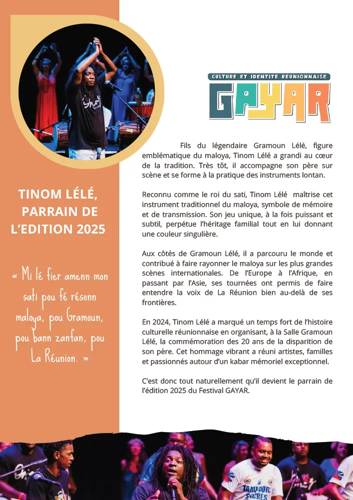 Avec pour parrain l’artiste Tinom Lélé, fils du légendaire Gramoun Lélé, cette nouvelle édition s’annonce comme un hommage vivant à l’héritage réunionnais, tout en ouvrant un espace de création et de rencontres entre générations