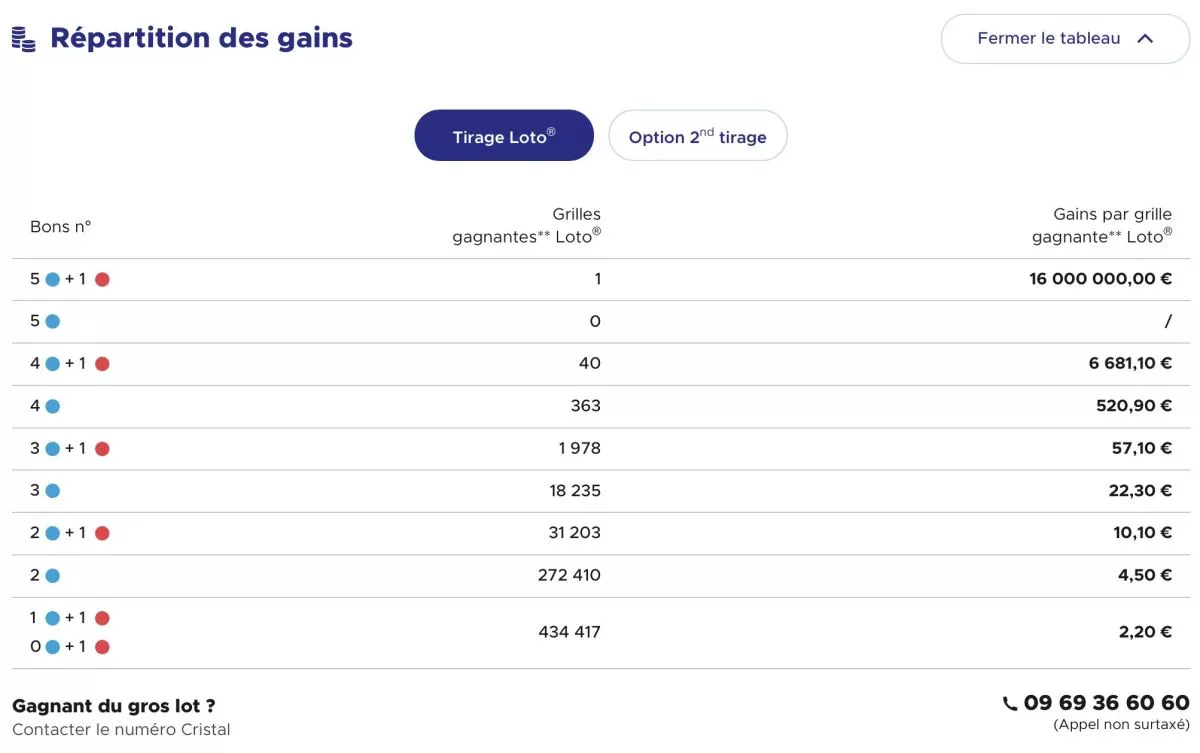 Plus de 700 000 grilles qui ont été gagnantes partout en France, remportant des gains allant de 2,20€, le simple remboursement pour avoir trouvé le numéro Chance jusqu’à un gain de 6 681€ auprès de 40 joueurs ayant trouvé 4 des 5 bons numéros ainsi que le numéro Chance. Évidemment, n’oublions pas non plus les dix joueurs qui remportent ce soir 20 000€ à la tombola Loto.