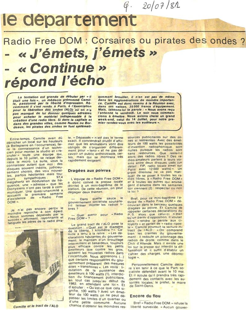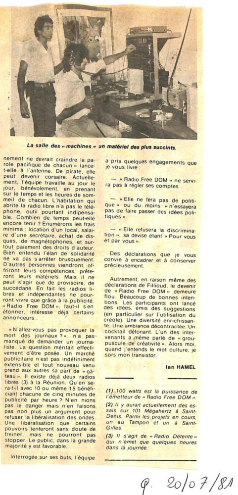 – La première photo du premier studio de Radio Free Dom dans une cave de Bellepierre est historique avec le célèbre émetteur italien de 100 W de marque « Itelco » posé sur la table, à coté de la table de mixage « POWER » dans son rack à la « verticale » et les 2 platines tourne-disques. On voit même le câble coaxial qui sort de l’émetteur pour aller sur le toit se brancher à l’antenne dipôle (une « Sherman ») : du jamais vu !