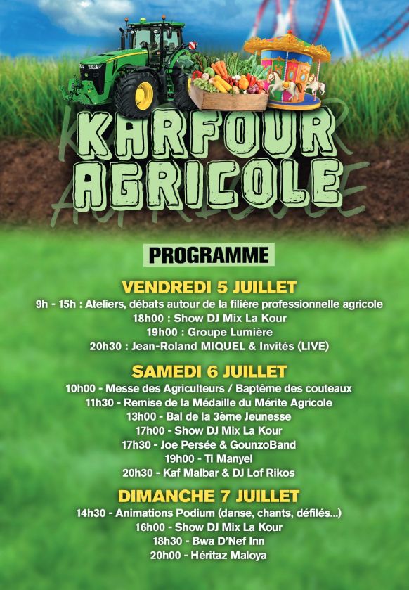 Venez fêter l’agriculture, découvrir les produits locaux lors de cette 2ème édition du Karfour Agricole organisé par l’Association des Agriculteurs de Saint-Leu et qui se déroulera les 5, 6, 7 juillet prochains sur la Place du Foirail à Piton Saint-Leu !