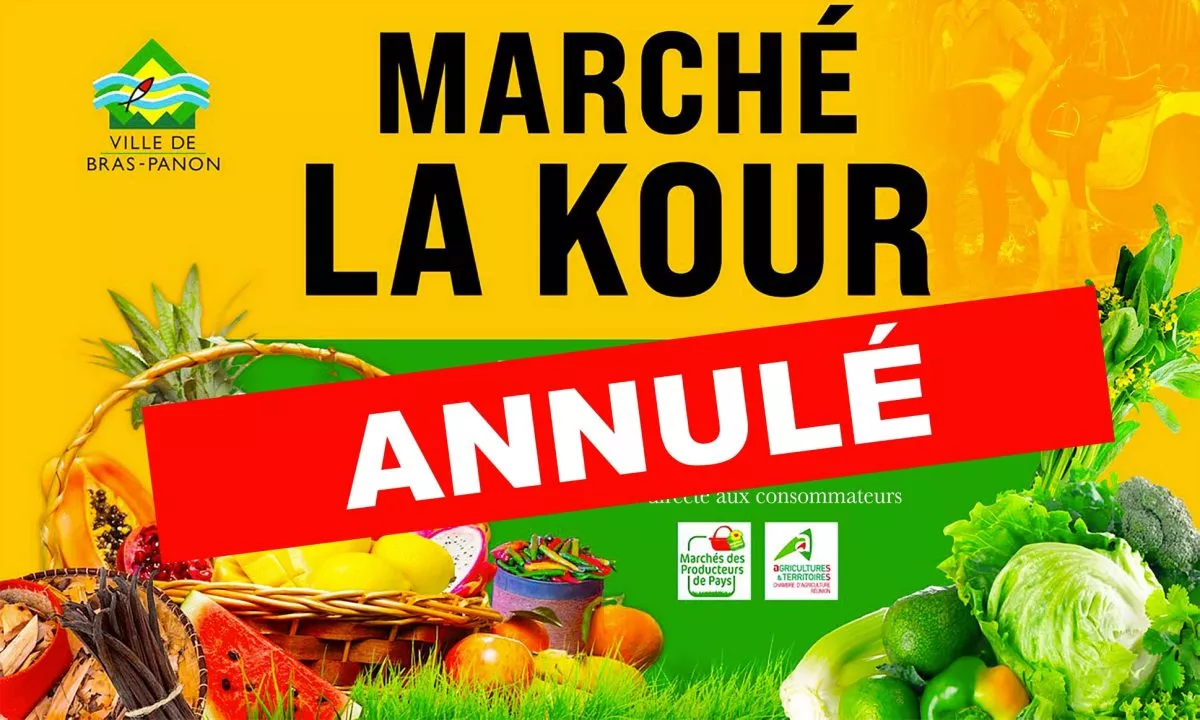 En raison des intempéries et de la situation sanitaire actuelle, la Ville de Bras-Panon et l’Association des Marchés de Producteurs sont au regret de vous informer de l’annulation du « Marché la Kour » qui devait se tenir le dimanche 16 janvier prochain à Bras-Panon.