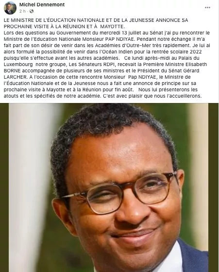 « Lors des questions au Gouvernement du mercredi 13 juillet au Sénat j’ai pu rencontrer le Ministre de l’Education Nationale Monsieur PAP NDIYAE. Pendant notre échange il m’a fait part de son désir de venir dans les Académies d’Outre-Mer très rapidement. Je lui ai alors formulé la possibilité de venir dans l’Océan Indien pour la rentrée scolaire 2022 puisqu’elle s’effectue avant les autres académies. Ce lundi après-midi au Palais du Luxembourg notre groupe, Les Sénateurs RDPI, recevait la Première Ministre Elisabeth BORNE accompagnée de plusieurs de ses ministres et le Président du Sénat Gérard LARCHER. A l’occasion de cette rencontre Monsieur Pap NDIYAE, le Ministre de l’Éducation Nationale et de la Jeunesse nous a fait une annonce de principe sur sa prochaine visite à Mayotte et à la Réunion pour fin août. Nous lui présenterons les atouts et les spécifiés de notre académie. C’est avec plaisir que nous l’accueillerons. »