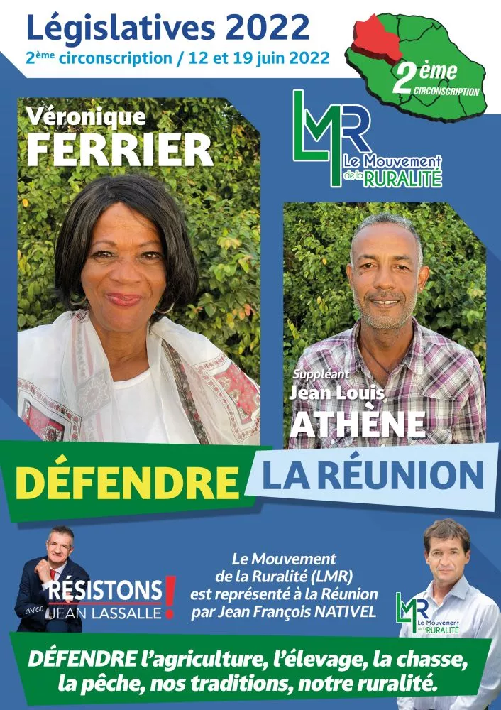 Pour répondre aux exigences de parité, le Mouvement de la Ruralité place également une candidate dans la 2ème circonscription, Véronique Ferrier. C’est une retraitée de 67 ans, mère de 6 enfants, née à la Grande Fontaine Saint-Paul. Alors qu’elle avait 12 ans, elle a été arrachée à sa terre natale, pour devenir ce que l’on appelle une « enfant de la Creuse ». Cette expérience a conduit à forger son caractère et sa combativité. De retour dans son île en 1980, elle a vécu et travaillé au Port dans des cliniques. Devenue déléguée du personnel, puis responsable syndical, elle a mené plusieurs luttes victorieuses pour défendre les droits bafoués des salariés.
