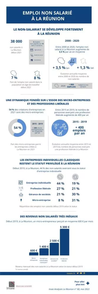 Début 2021, à La Réunion, 38 000 personnes exercent une activité non salariée, soit 7 % de la population en âge de travailler. Depuis les années 2000, le non-salariat se développe fortement sur l’île. Entre 2000 et 2020, l’emploi non salarié y augmente en effet à un rythme trois fois plus élevé que dans les régions métropolitaines de province, pour atteindre aujourd’hui un développement proche de la moyenne nationale.