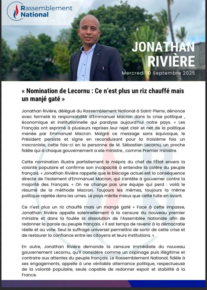 « La nomination de Sebastion Lecornu à Matignon prouve que le Président de la République Emmanuel Macron n’entend rien lâcher, ne comprend rien à la situation politique et s’entête à gouverner contre la majorité du pays. Plus que jamais la mobilisation populaire et la rupture radicale avec un macronisme agonisant sont nécessaires pour tracer un autre chemin pour notre île et la France : celui de la justice sociale et fiscale, de la bifurcation écologique, de la refondation démocratique et du développement pour La Réunion ».