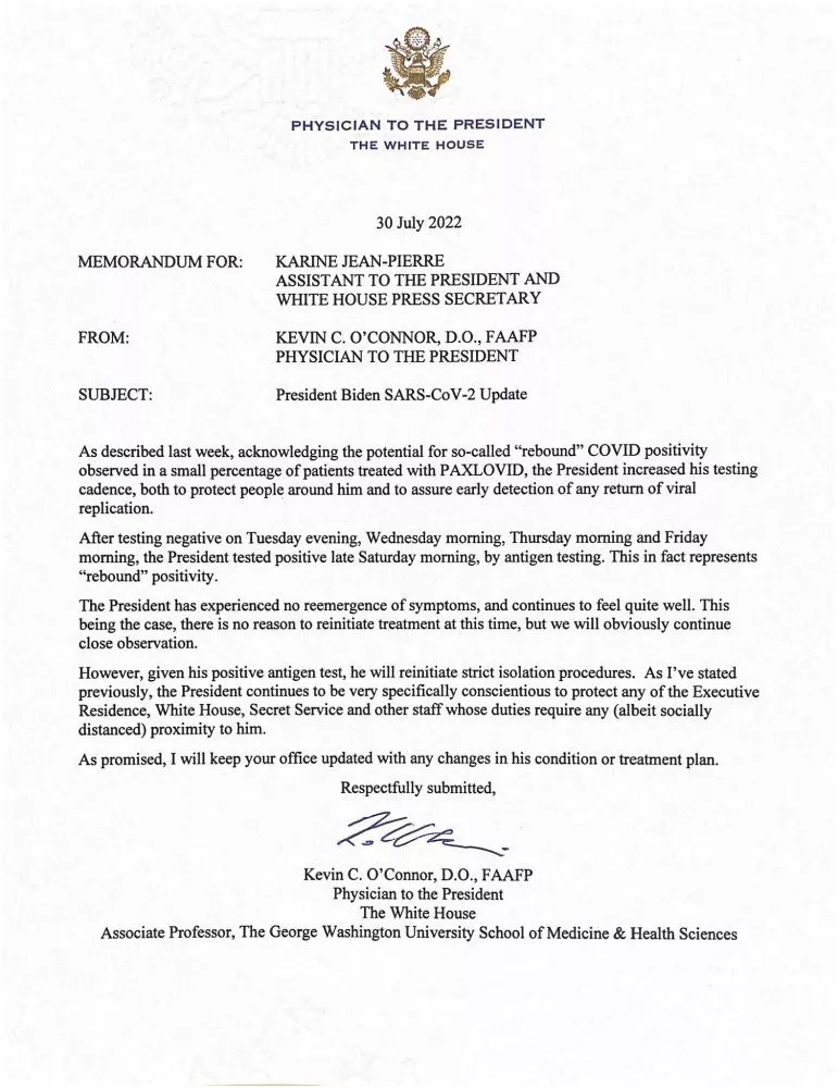 « Comme décrit la semaine dernière, reconnaissant le potentiel de positivité COVID dite « de rebond » observée chez un petit pourcentage de patients traités avec PAXLOVID, le président a augmenté sa cadence de test, à la fois pour protéger les personnes qui l’entourent et pour assurer une détection précoce de tout retour de réplication virale.