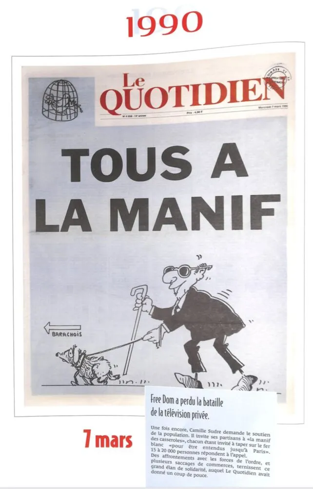 Le Quotidien apporte son soutien à cette manifestation en publiant à la UNE un aveugle qui va manifester pour une télévision, une note d’humour pour dire qu’il ne s’agit pas seulement d’un combat pour une télévision mais surtout un combat pour la liberté et le pluralisme !