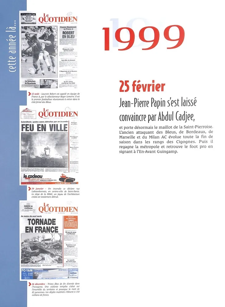 -25 février 1999 : Jean-Pierre Papin signe avec Abdul Cadjee : il jouera six match avec la Saint-Pierriose… On ne connaît pas le montant du contrat !