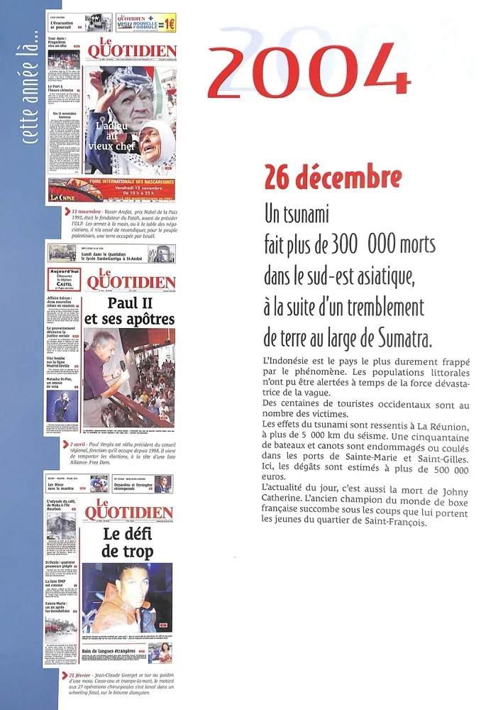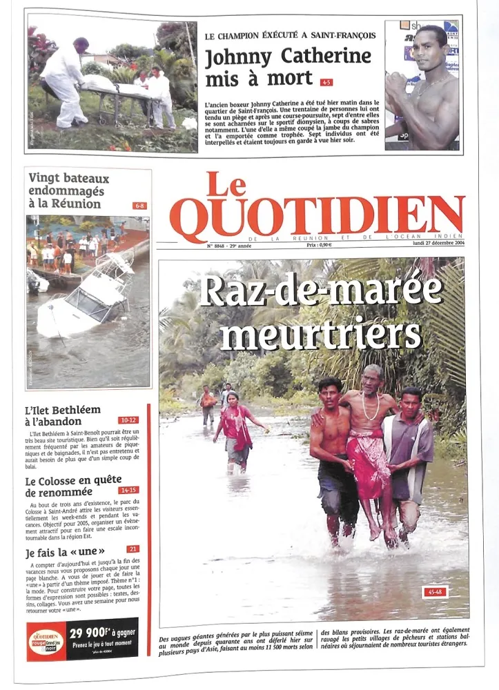 -28 décembre 2004 : ce dimanche 26 décembre 2004 sera une journée inoubliable pour radio Free Dom : en réveillant le matin on entend sur Europe 1 qu’il y a eu un effroyable tsunami en Indonésie, et toutes les heures Europe1 annonçait les milliers et les milliers de mort de morts qui ne cessent d’augmenter… Aux alentours de midi, à la Réunion, Manu était à l’antenne au micro de radio Free Dom, lorsque des appels d’auditeurs stupéfaits disaient que la mer était en train de se retirer dans le port de Sainte-Marie, et ensuite une énorme vague a coulé quelques bateaux et en a endommagés une vingtaine. : pareil à Saint-Gilles au Port etc. etc. Au début personne ne comprenait ce qui se passer, à la préfecture c’était silence radio, et il a fallu de longues minutes et même plusieurs heures avant de comprendre que ce phénomène était ta relation avec le tsunami à des milliers de kilomètres de là (6721 km)