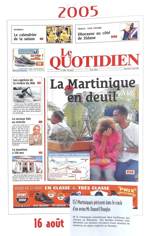 -16 août 2005 : crash aérien au Venezuela d’un avion Colombien venant du Panama, il y avait 152 Martiniquais à bord…C’est la pire tragédie pour la Martinique, après l’éruption du volcan de la Pelée de Saint-Pierre en 1902.