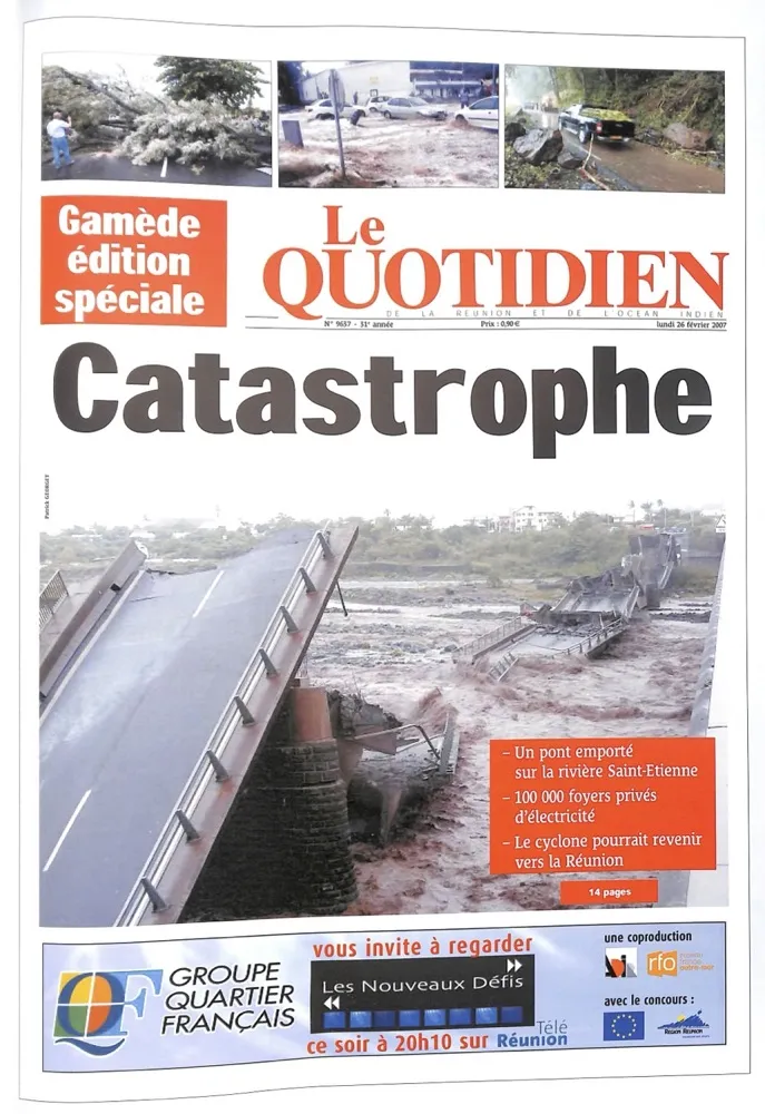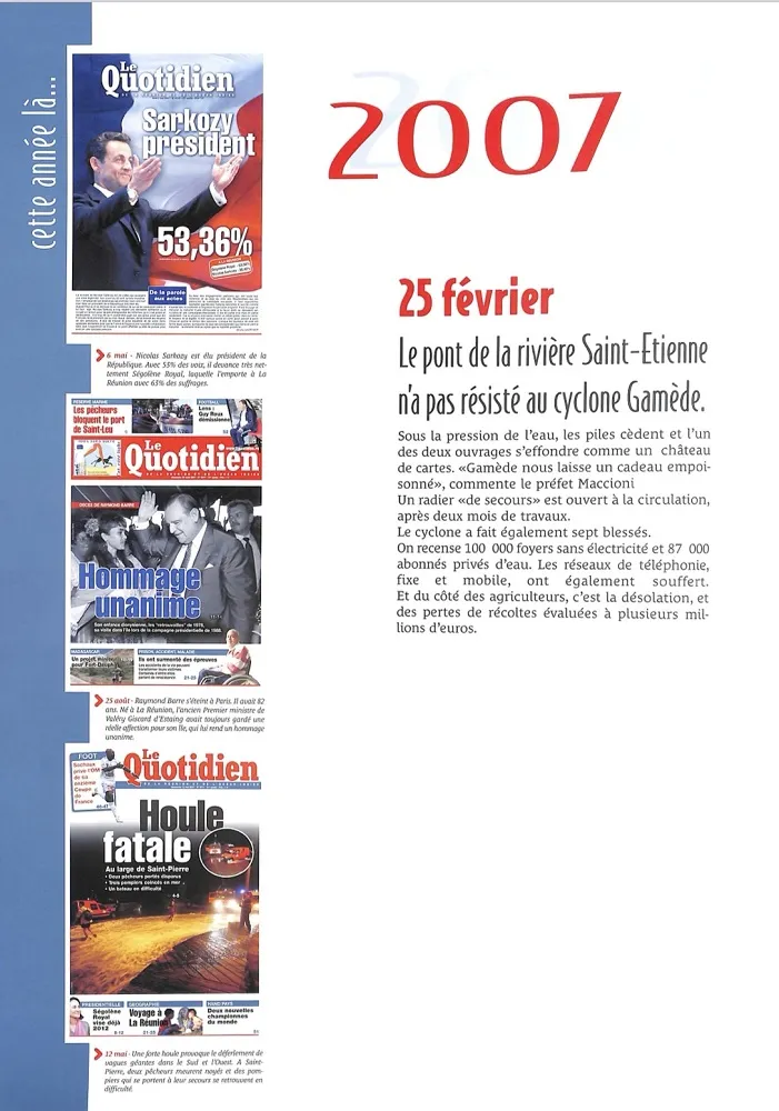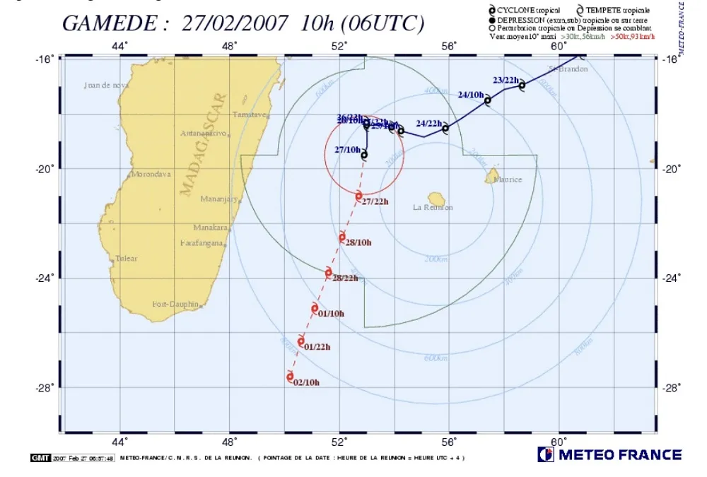 -25 février 2007 : Le cyclone Gamède passera au plus près de l’île dans la nuit de samedi 25 au dimanche 26 Février 2007 à une distance d’environ 250 kilomètres au stade de CTI (Cyclone Tropical Intense).