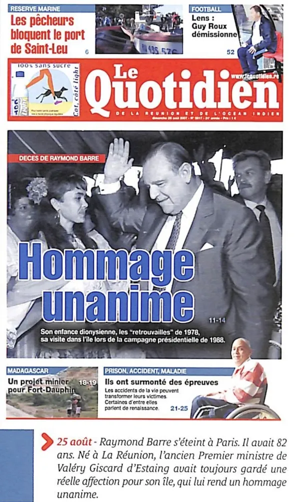 -25 août 2007 : Raymond Barre, l’illustre homme politique réunionnais , ancien premier ministre de Valerie Giscard d’Estaing, ancien maire de Lyon, s’éteint à l’âge de 82 ans.