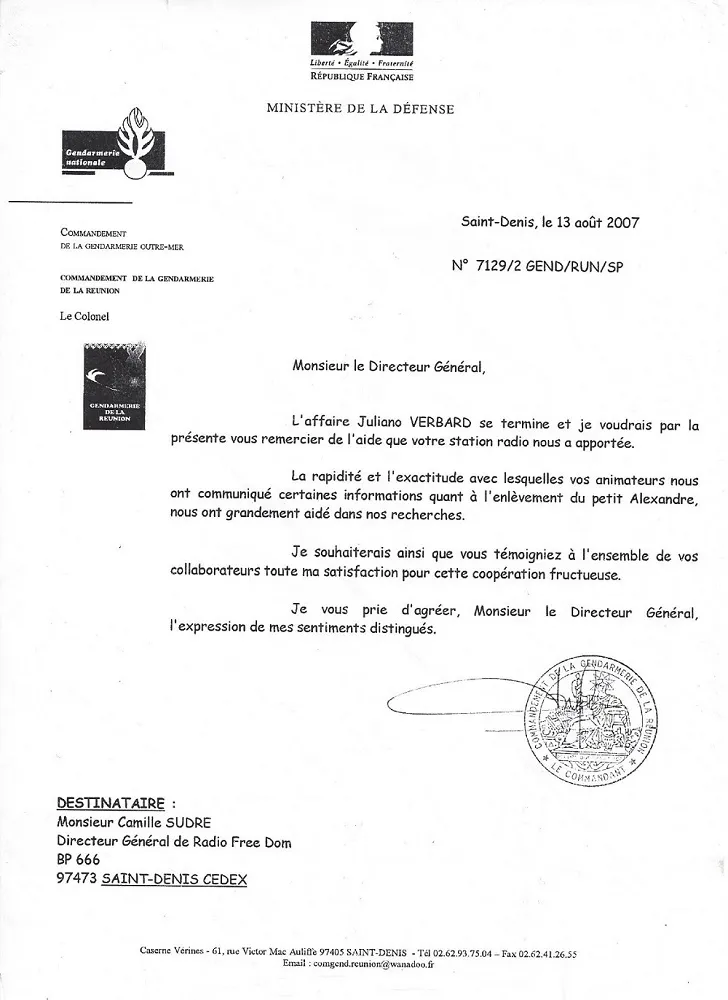 Le commandant de l’gendarmerie de la Reunion remercie toute l’équipe de radio Free Dom pour leur aide dans l’enlèvement du petit Alexandre.