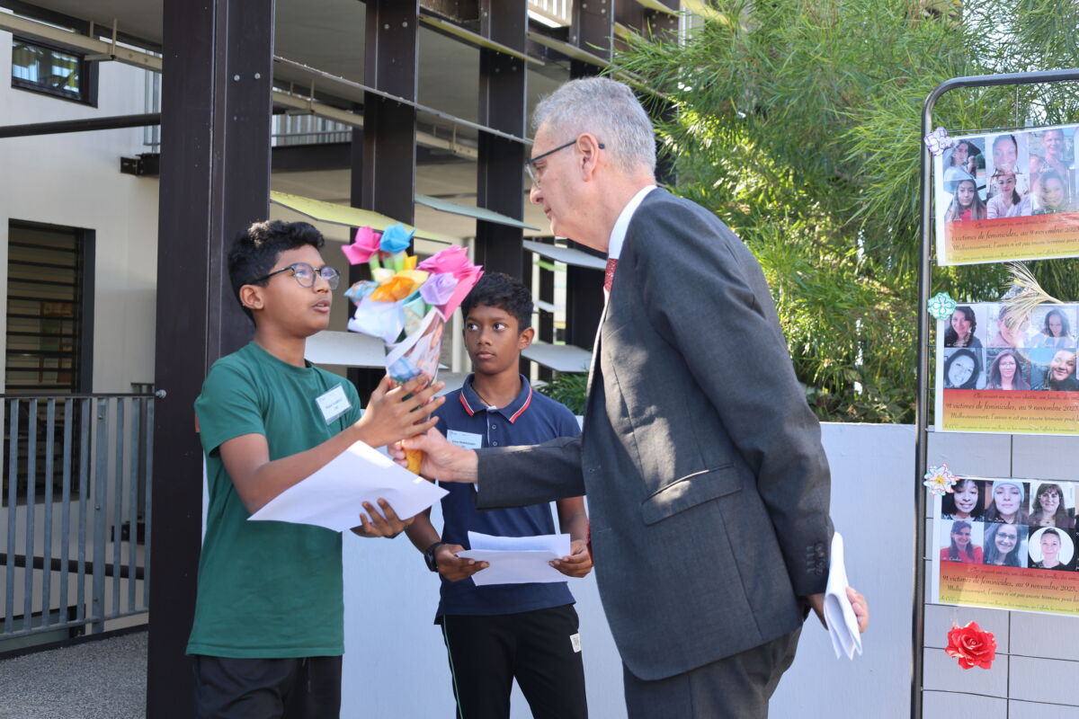 Ce matin du 25 novembre, le recteur de région académique, Rostane Mehdi, s’est rendu au collège Roquefeuil à Saint-Gilles-les-Bains dans le cadre de la Journée internationale pour l’élimination de la violence à l’égard des femmes.